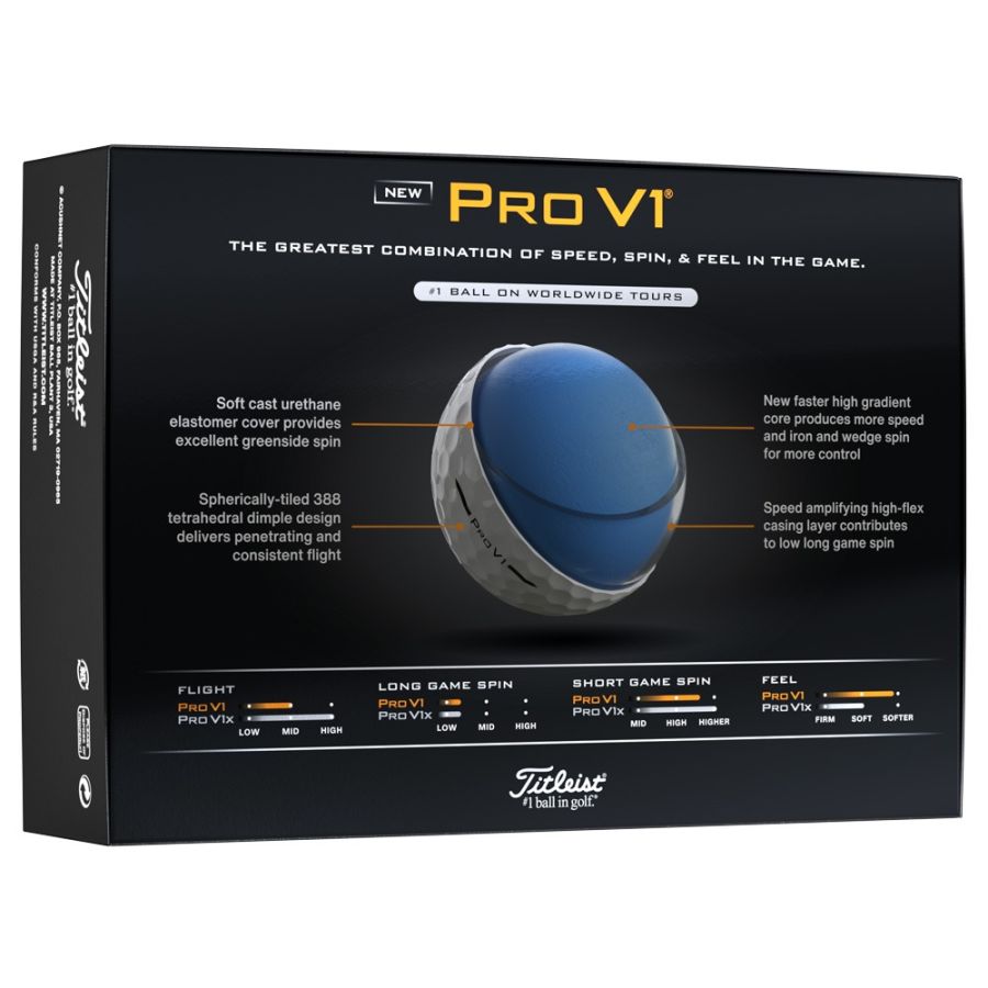 Due to its unique dimple pattern, Pro V1 has a lower flight than Pro V1x. A softer gradient core produces a softer feel and slightly less spin than Pro V1x.